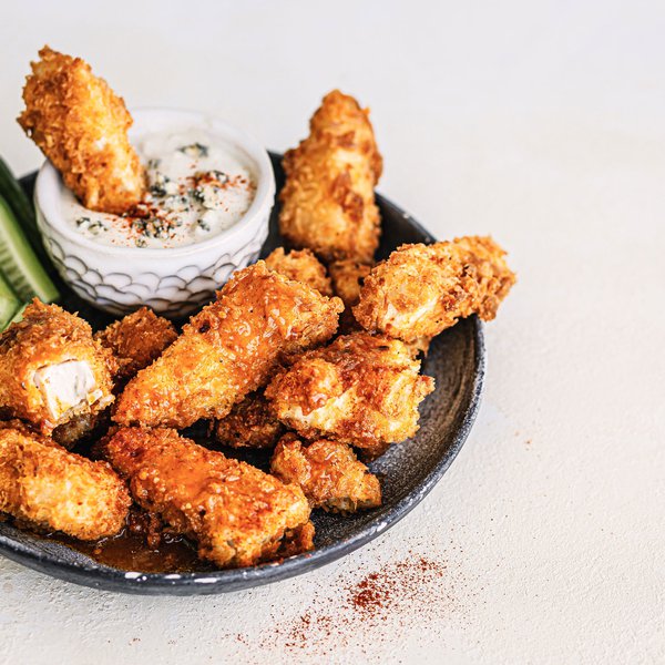 يتم تقطيع التوفو إلى شرائح سمكها 3-4 سنتم ثم توزّع في وعاء. تُضاف 3 ملاعق من زيت الزيتون ويُقلب المزيج حتى يغلّف الزيت قطع التوفو، ثم تُضاف التوابل ونصف ملعقة من الملح ومسحوق الثوم، ويُقلّب المزيج جيداً ثمّ يُمد في صينية خَبز بطبقة سويّة، ويُخبز في الفرن لمدة 20 دقيقة أو حتى يكتسب لوناً ذهبياً ويصبح قوامه مقرمشاً.