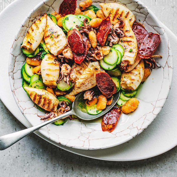 يُزيّن طبق التقديم بأوراق الخسّ، وتوضع سلطة الحبار وأذرعه المقلية فوقها.