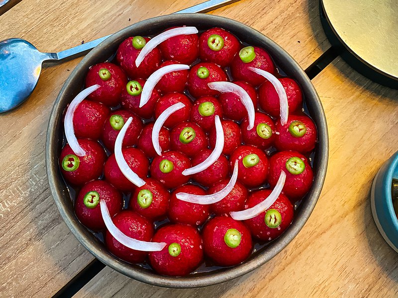 The ‘neolokal tasting menu’ features amuse-bouches like cucumber blossoms with yoghurt, deep-fried octopus with spicy mayo and crispy squid with walnut purée. A colourful medley of grilled asparagus, fresh cherries, mulberries, fennel and beetroot on a pool of vegetable juice and tahini is served next, alongside tomato-stuffed grilled octopus with clarified tomato broth, and neolokal’s signature dish, moreish morel-stuffed dumplings encased in mushroom skin with a mushroom emulsion and chilli oil.