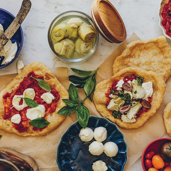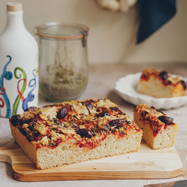 Tear the bocconcini and arrange over the tomato sauce. Arrange the polenta discs overlapping slightly over the cheese. Drizzle with the remaining olive oil.