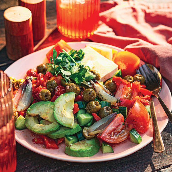 Halve and quarter the tomatoes. Quarter the red onions. Pit the olives. Halve a lemon. Chop the cucumber into chunks.