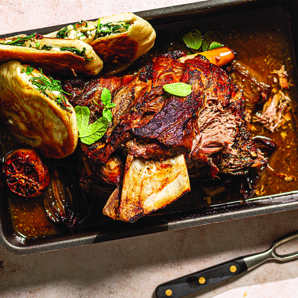 Roast for 30 minutes, or until starting to colour, then reduce the temperature to 180°C, gas mark 4, and roast for a further 35-40 minutes until golden brown. Transfer the leg of lamb to a second tray and set aside for 15 minutes to rest before slicing.