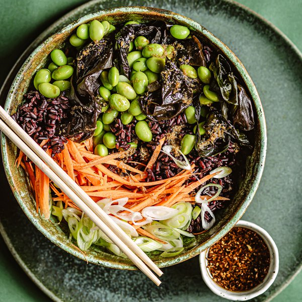 Download PDFTo make the furikake mix, toast the sesame seeds in a frying pan and crumble the nori sheets. Mix the sesame seeds with the crumbled nori, salt, sugar, black sesame seeds, bonito flakes and chilli flakes.