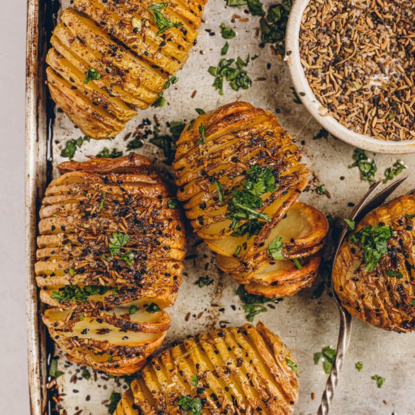 Remove the potatoes from the oven and toss in the dressing to coat. Finely chop the coriander and sprinkle over the roasted potatoes. Serve immediately.