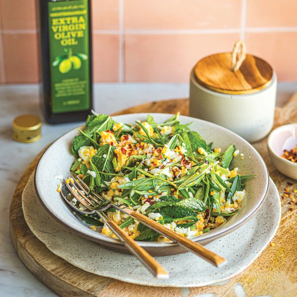 Roughly tear or cut up the Lebanese bread and spread evenly over a baking tray. Drizzle with 4 tbsp of olive oil and toss to coat. Place in the oven for 10 minutes or until golden and crisp.