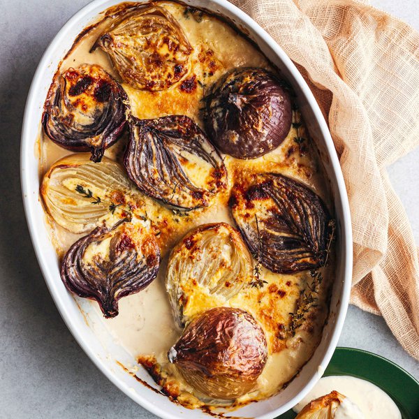 Before stuffing the onions, spread a light layer of olive oil on the bottom of a large oven-proof baking dish.