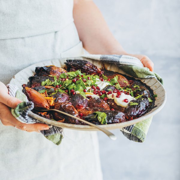 Arrange the aubergines on a serving platter and drizzle with the dressing. Top with the pomegranate seeds, pine nuts and mint leaves.